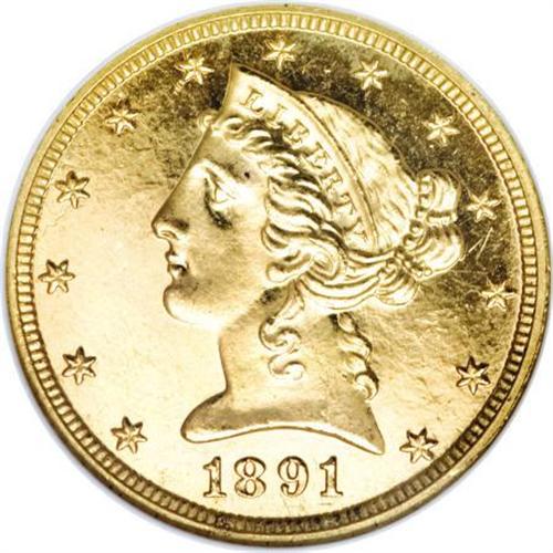 <B>1891 $5 --Triple Struck with Reverse Rotation--PR64 Ultra Cameo NGC.</B></I> This rare proof half eagle was struck at least three times by the dies. Of course, all proof Liberty fives were multiple struck, to bring out complete definition. What makes the present piece an error is that the hammer (reverse) die was apparently loose, and rotated a couple of degrees between strikes. The anvil (obverse) was stationary.<BR> As a result, the obverse shows no evidence of a multiple strike, but the reverse has faint rotated impressions from the prior two strikes. These are most apparent above the eagle's right (facing) shoulder, and southwest of the eagle's beak. For the final strike, the dies were close to medal turn.<BR> The devices are fully frosted, and contrast greatly with the darkly mirrored fields. Hair-thin field imperfections near the date, star 10, and the neck curls are all that limit the grade. A mere 53 proofs were struck, and perhaps half that number have survived. The NGC and PCGS population data are undoubtedly inflated by resubmissions over the past 22 years. Census: 4 in 64 Ultra Cameo, 9 finer (1/08).<BR><BR><b>Shipping:</b> Coins & Currency (<a target="_blank" href="http://www.heritageauctions.com/common/shipping.php">view shipping information</a>)