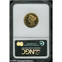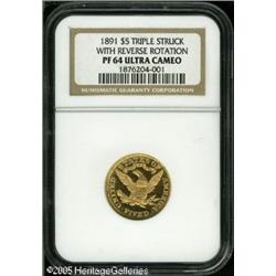 <B>1891 $5 --Triple Struck--PR64 Ultra Cameo NGC.</B></I> This is an amazing Proof half eagle that was triple struck with rotation between strikes on the reverse. The obverse does not show any evidence of the extra impressions from the die. The first and second impression of the design on the reverse are evident in a counterclockwise position relative to the third impression. In addition to the importance of this example from the extra strikes, it is also a rarity, one of just 53 examples coined in Proof format. Further, the 1891 half eagle is also a lower mintage issue in business strike, meaning that the overall rarity is an important factor when considering the demand of this issue.<BR> Different sources suggest disparaging survival rates for this issue. In his <I>Complete Encyclopedia,</B></I> Walter Breen suggested that about 25 to 30 different Proofs of this issue survive, representing about 60% of the recorded mintage. Including resubmissions, NGC and PCGS have combined to certify 45 examples. Perhaps this population total does fall in line with the Breen survival estimate. At Heritage, a check of our Auction Archives indicates that this is <I>only the second time</B></I> that we have offered a proof example of this date in all of our sales over the last dozen years. A complete and accurate roster of known examples has not been attempted, to the best of our knowledge, and would be difficult to accomplish. So many of the gold proofs are similar in appearance that plate matching over many years of auction offerings is rendered quite difficult. Of course, the description of this example with its tripled reverse would be unmistakable. We suspect that this particular example, with its extra design impressions, is most likely unique.<BR> The surfaces have light yellow-gold color with mirrored fields and highly lustrous devices. A few light abrasions are visible on each side. There is a small black spot just above Liberty's eyebrow and a couple others on the obverse rim. These minor blemishes limit the grade and keep it from Gem quality. The devices are highly lustrous with frosty light yellow color. A few small lint marks attest to the proof status of this coin. One of these is located just below star 4. The most noticeable evidence of triple striking on the reverse is in the fields around the eagle, especially in the open areas above the eagle and below the motto. Certain of the letters in the motto and denomination are also tripled with this evidence weak but visible. The fields themselves have the wavy or watery appearance so often seen on proof gold coins. This is truly an amazing ultra cameo proof with exceptional eye appeal and a high degree of desirability. Lot:8670