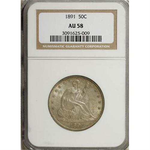 <B>1891 50C AU58 NGC.</B></I> NGC Census: (12/102). PCGS Population (13/125). Mintage: 200,000. Numismedia Wsl. Price for NGC/PCGS coin in AU58: $325. (#6373)<BR><BR><B>Coin Engraver:</B> Christian Gobrecht<BR><BR><b>Shipping:</b> Coins & Currency (<a target="_blank" href="http://www.heritageauctions.com/common/shipping.php">view shipping information</a>)