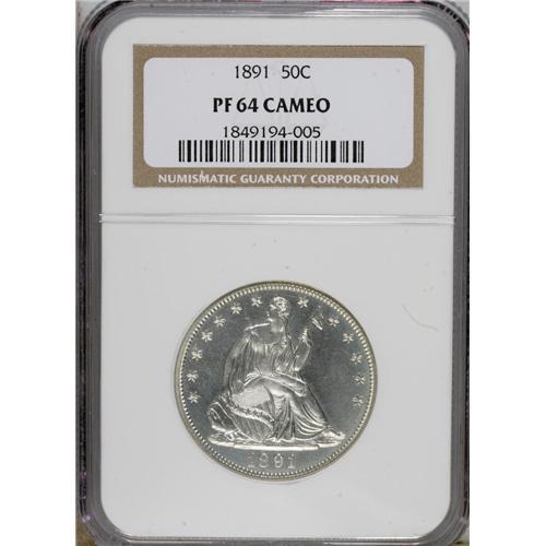 <B>1891 50C PR64 Cameo NGC.</B></I> This lovely specimen represents the final year of the long-lived Seated Liberty series. The design elements are fully struck with admirable proof sharpness. Entirely untoned, the surfaces display watery depths of reflectivity in the fields and nicely frosted devices. Neither side of the coin suffers from hairlines or bothersome handling marks. Census: 7 in 64 Cameo, 16 finer (4/07).<BR><BR><b>Shipping:</b> Coins & Currency (<a target="_blank" href="http://www.heritageauctions.com/common/shipping.php">view shipping information</a>)
