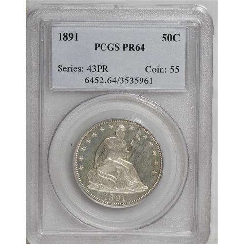 <B>1891<50C> PR64 PCGS.</B></I> Diagonal patches of hazy cream toning partly obscure the watery mirrors. The devices on either side have strong cameo contrast, though the coin lacks the designation.