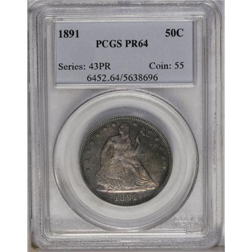 <B>1891<50C> PR64 PCGS.</B></I> From a tiny mintage of only 600 proofs comes this beautiful specimen. Boldly detailed and deeply mirrored on both sides, though heavy russet, violet, and orange patina obscures the mirrors on the obverse. A lovely and important example from the last year of the design. Population: 47 in 64, 30 finer (7/06).