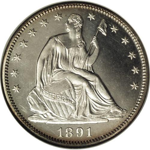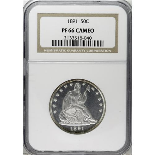 <B>1891 50C PR66 Cameo NGC.</B></I> This better date proof represents the last year of issue of the Seated Liberty half dollar series. The fields are lightly toned around the rims, and the crisply struck, moderately frosted motifs stand out against the deep mirrors. A handful of incidental flaws on each side are hardly bothersome. Census: 7 in 66 Cameo, 3 finer (12/06).<BR><BR><b>Shipping:</b> Coin/Currency (<a target="_blank" href="http://www.heritageauctions.com/common/shipping.php">view shipping information</a>)