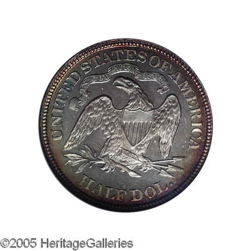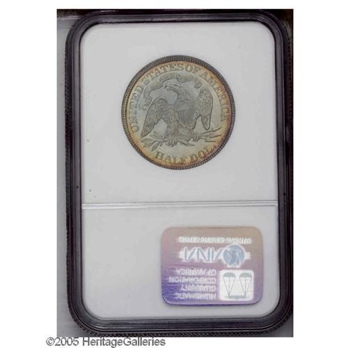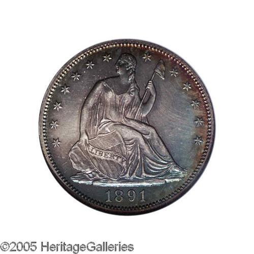 <B>1891<50C> PR66 NGC.</B></I> A popular, low-mintage issue from the last year of the Seated Liberty design. A delightful specimen with multicolored toning in steel-blue, lemon-yellow, magenta, and sea-green, with radiant luster underneath. Boldly struck and essentially distraction-free. Census: 14 in 66, 4 finer (12/05).