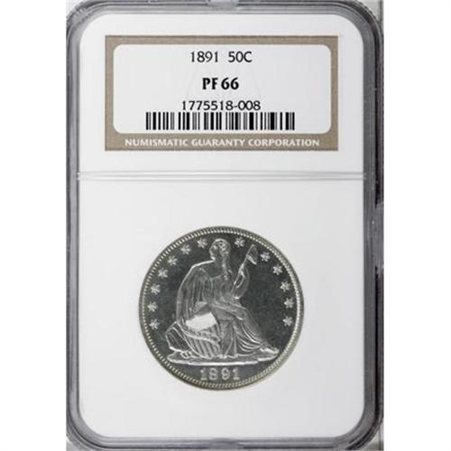 <B>1891 50C PR66 NGC.</B></I> Strongly mirrored and essentially brilliant with a degree of contrast on each side, though the cameo effect of the obverse is too mild for the coin to receive an official designation. Crisply struck and carefully preserved, a wonderful survivor from this final-year issue of only 600 specimens. Census: 16 in 66, 4 finer (3/08).<BR><BR><B>Coin Engraver:</B> Christian Gobrecht<BR><BR><b>Shipping:</b> Coins & Currency (<a target="_blank" href="http://www.heritageauctions.com/common/shipping.php">view shipping information</a>)