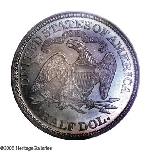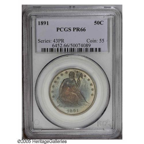 <B>1891<50C> PR66 PCGS.</B></I> Light blue-green and rose toning visits this exquisitely struck and impressively mirrored premium Gem. An undisturbed and high gray specimen, nicely die doubled on the lower reverse. Only 600 proofs were struck for the final year of the design type. Population: 10 in 66, 1 finer (11/05).