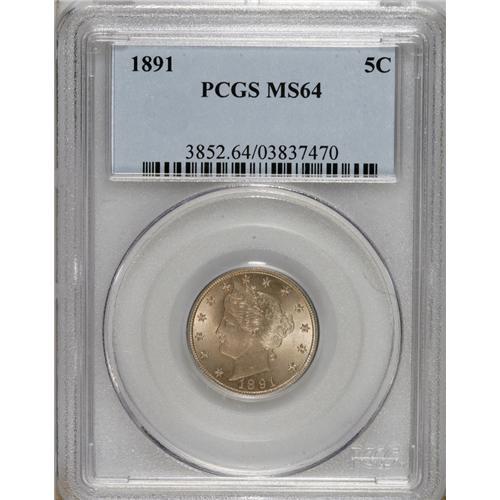 <B>1891 5C MS64 PCGS.</B></I> PCGS Population (132/70). NGC Census: (117/72). Mintage: 16,834,350. Numismedia Wsl. Price for NGC/PCGS coin in MS64: $260. (#3852)<BR><BR><b>Shipping:</b> Coins & Currency (<a target="_blank" href="http://www.heritageauctions.com/common/shipping.php">view shipping information</a>)