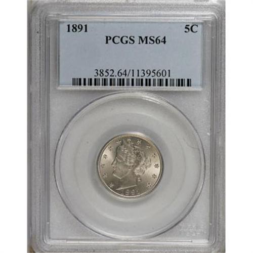 <B>1891 5C MS64 PCGS.</B></I> PCGS Population (139/75). NGC Census: (117/71). Mintage: 16,834,350. Numismedia Wsl. Price for NGC/PCGS coin in MS64: $260. (#3852)<BR><BR><B>Coin Engraver:</B> Charles E. Barber<BR><BR><b>Shipping:</b> Coins & Currency (<a target="_blank" href="http://www.heritageauctions.com/common/shipping.php">view shipping information</a>)