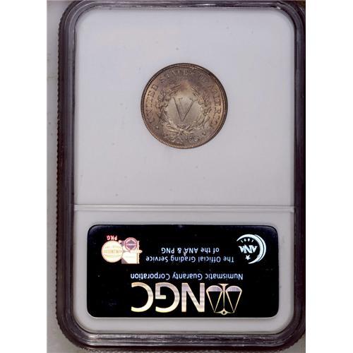 <B>1891<5C> MS65 NGC.</B></I> Glowing luster radiates from frosty-textured surfaces that are covered with a thin veneer of tan-gold color. The design elements are well brought up, save for minor softness in a few of the star centrils and in the wreath immediately to the left of the bowknot. A couple of trivial marks on Liberty's cheek are all that keeps this magnificent Liberty nickel from achieving a higher grade. Census: 55 in 65, 14 finer (6/06).