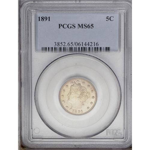 <B>1891<5C> MS65 PCGS.</B></I> Highly lustrous with brilliant nickel color beneath light champagne toning. A few stars are weak, as is the lower left part of the wreath, but all other design elements are sharply detailed. Population: 78 in 65, 10 finer (4/06).