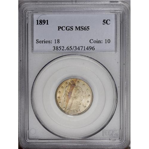 <B>1891<5C> MS65 PCGS.</B></I> Light to medium honey and plum streaks are more prominent on the obverse. A beautifully preserved and lustrous Gem. Well struck save for the usual incompleteness on the left corn ear.