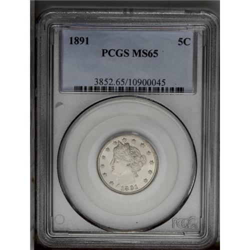 <B>1891<5C> MS65 PCGS.</B></I> Nickel-gray surfaces reveal just a few trivial marks that prevent an even higher grade. The design elements are sharply impressed throughout. Population: 77 in 65, 10 finer (3/06). <BR><BR><B>Important notice:</B> Heritage usually auctions material at the rate of 200-250 lots per hour. On some occasions eBay Live bid software or the Internet may not be able to keep up with the pace of the auction. We recommend placing a realistic absentee bid now as insurance to avoid disappointment. Occasionally the auctioneer may eliminate or reject an eBay Live bid, and the auctioneer may also reopen a lot after the close of the eBay live bidding (usually because we missed an audience bid), and may reject your bid even if it shows you as the winning bidder. By bidding via eBay Live, you agree that Heritage may award the lot to another bidder at its sole discretion under the circumstances described above or any other reasonable circumstances. Since eBay bids are not shown to us until we open the lot on the floor, we treat those bids just like floor bids. In most cases the floor responds before the eBay bid is presented to us, due to Internet lag time, so for consistency we have made it a policy that floor bids are always considered first over tie eBay live bids. Also please note that all Heritage lots purchased through eBay Live carry a 20% Buyer's Premium. Please make sure you read the Terms and Conditions before you bid. This lot is being auctioned in conjunction with a live floor auction by Heritage Galleries & Auctioneers. All final auction and invoice information will be supplied by Heritage Galleries & Auctioneers, and all other information should be considered preliminary. Lot:925 <BR><BR><B>Winning Notification and Billing:</B> After the FINAL session in this auction is complete, Heritage will send e-mail and snail mail invoices. This process normally takes several days. All final auction and invoice information will be supplied by Heritage Galleries & Auctioneers, and all other information should be considered preliminary. <BR><BR>This auction will be conducted on a live auction floor and over the Internet through eBay Live. If you choose to place an absentee bid, please take a moment to <font color='#0000ff'><u><a href='http://pages.ebay.com/liveauctions/help/before/laabsentee.html'>learn how eBay Live absentee bidding works</a></u></font><font color='#000000'>