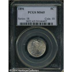 1891 5C MS65 PCGS. The design elements are well st <B>1891 5C MS65 PCGS.</B></I> The design elements are well struck, except for weakness in the two lower left star centers, and in the ear of corn and leaves to the left of the bow knot. Touches of coppery-gold color, somewhat deeper on the obverse, are noted over lustrous surfaces. A few tiny, unimportant marks are mentioned on Liberty's chin, and in the left obverse field. Population: 51 in 65, 7 finer (10/04). <BR><BR><B>Important notice:</B> Heritage usually auctions material at the rate of 200-250 lots per hour. On some occasions eBay Live bid software or the Internet may not be able to keep up with the pace of the auction. We recommend placing a realistic absentee bid now as insurance to avoid disappointment. Occasionally the auctioneer may eliminate or reject an eBay Live bid, and the auctioneer may also reopen a lot after the close of the eBay live bidding (usually because we missed an audience bid), and may reject your bid even if it shows you as the winning bidder. By bidding via eBay Live, you agree that Heritage may award the lot to another bidder at its sole discretion under the circumstances described above or any other reasonable circumstances. Since eBay bids are not shown to us until we open the lot on the floor, we treat those bids just like floor bids. In most cases the floor responds before the eBay bid is presented to us, due to Internet lag time, so for consistency we have made it a policy that floor bids are always considered first over tie eBay live bids. Also please note that all Heritage lots purchased through eBay Live carry a 20% Buyer's Premium. Please make sure you read the Terms and Conditions before you bid. This lot is being auctioned in conjunction with a live floor auction by Heritage Galleries & Auctioneers. All final auction and invoice information will be supplied by Heritage Galleries & Auctioneers, and all other information should be considered preliminary. Lot:5527