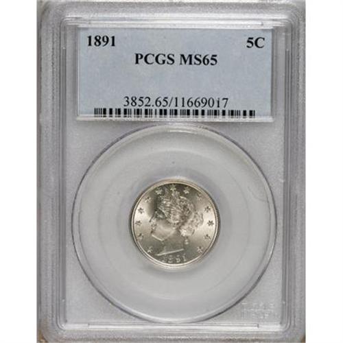 <B>1891 5C MS65 PCGS.</B></I> A hint of gold patina enhances this highly lustrous and unblemished Gem. The strike is sharp aside from a couple of star centers. Population: 60 in 65, 12 finer (4/07).<BR><BR><b>Shipping:</b> Coins & Currency (<a target="_blank" href="http://www.heritageauctions.com/common/shipping.php">view shipping information</a>)