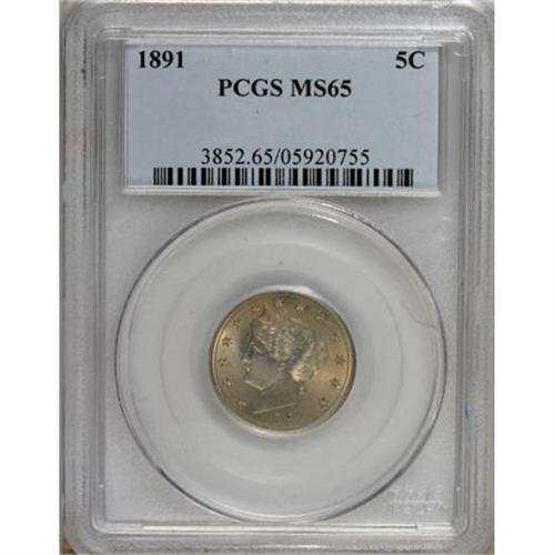 <B>1891 5C MS65 PCGS.</B></I> Golden-gray patina rests on lustrous surfaces that exhibit sharply struck design elements. Well preserved throughout. Population: 63 in 65, 12 finer (7/07).<BR><BR><B>Coin Engraver:</B> Charles E. Barber<BR><BR><b>Shipping:</b> Coins & Currency (<a target="_blank" href="http://www.heritageauctions.com/common/shipping.php">view shipping information</a>)