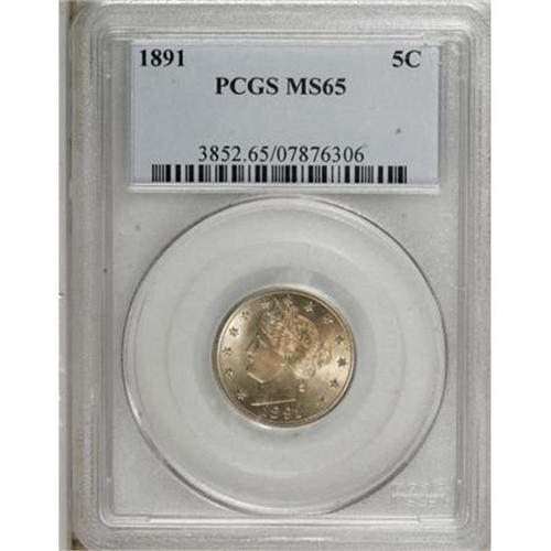 <B>1891 5C MS65 PCGS.</B></I> This is a thrillingly radiant coin with beautiful champagne, gold, and reddish toning that is fully illuminated by the intense cartwheel luster. The right side obverse stars and reverse ear of corn are typically weak, but the surfaces are exquisitely preserved on both sides and the overall eye appeal of the piece is splendid. <BR><BR><B>Coin Engraver:</B> Charles E. Barber<BR><BR><b>Shipping:</b> Coins & Currency (<a target="_blank" href="http://www.heritageauctions.com/common/shipping.php">view shipping information</a>)