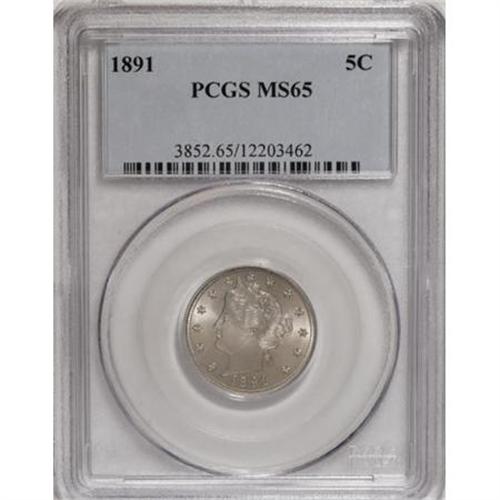 <B>1891 5C MS65 PCGS.</B></I> Boldly detailed save for a few isolated areas of weakness near the margins. This shining Gem shows splashes of gold and rose patina over pleasingly preserved surfaces.<BR><I>From The John Stimson, Sr. Collection, Part Two.</B></I><BR><BR><B>Coin Engraver:</B> Charles E. Barber<BR><BR><b>Shipping:</b> Coins & Currency (<a target="_blank" href="http://www.heritageauctions.com/common/shipping.php">view shipping information</a>)