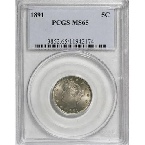 <B>1891 5C MS65 PCGS.</B></I> Unusually well-defined across the board with particularly strong detail on the lower wreath. Lovely peach and gold shadings grace softly lustrous, well-preserved surfaces.<BR><BR><B>Coin Engraver:</B> Charles E. Barber<BR><BR><b>Shipping:</b> Coins & Currency (<a target="_blank" href="http://www.heritageauctions.com/common/shipping.php">view shipping information</a>)