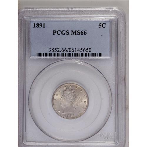 <B>1891<5C> MS66 PCGS.</B></I> The star nearest the truncation is flat, but otherwise, all the design elements are fully struck up. A lustrous piece with delightful lavender and gold patina. Population: 11 in 66, 0 finer (8/06).