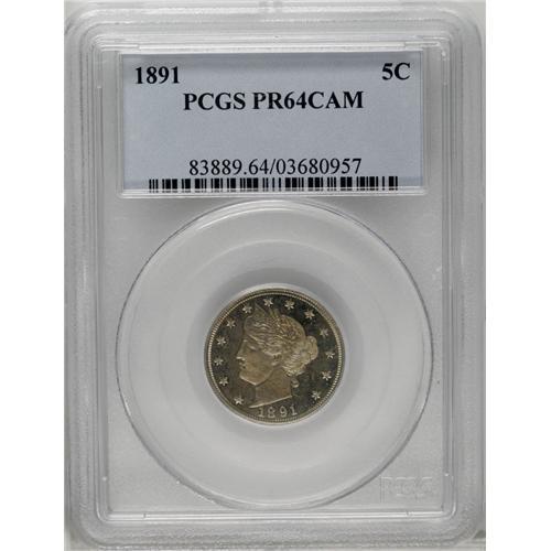 <B>1891<5C> PR64 Cameo PCGS.</B></I> A glittering Cameo proof with deeply mirrored fields and lustrous devices, all beneath splendid gold toning. A few tiny surface spots on the obverse keep this from a higher grade. <BR><BR><B>Important notice:</B> Heritage usually auctions material at the rate of 200-250 lots per hour. On some occasions eBay Live bid software or the Internet may not be able to keep up with the pace of the auction. We recommend placing a realistic absentee bid now as insurance to avoid disappointment. Occasionally the auctioneer may eliminate or reject an eBay Live bid, and the auctioneer may also reopen a lot after the close of the eBay live bidding (usually because we missed an audience bid), and may reject your bid even if it shows you as the winning bidder. By bidding via eBay Live, you agree that Heritage may award the lot to another bidder at its sole discretion under the circumstances described above or any other reasonable circumstances. Since eBay bids are not shown to us until we open the lot on the floor, we treat those bids just like floor bids. In most cases the floor responds before the eBay bid is presented to us, due to Internet lag time, so for consistency we have made it a policy that floor bids are always considered first over tie eBay live bids. Also please note that all Heritage lots purchased through eBay Live carry a 20% Buyer's Premium. Please make sure you read the Terms and Conditions before you bid. This lot is being auctioned in conjunction with a live floor auction by Heritage Galleries & Auctioneers. All final auction and invoice information will be supplied by Heritage Galleries & Auctioneers, and all other information should be considered preliminary. Lot:995 <BR><BR><B>Winning Notification and Billing:</B> After the FINAL session in this auction is complete, Heritage will send e-mail and snail mail invoices. This process normally takes several days. All final auction and invoice information will be supplied by Heritage Galleries & Auctioneers, and all other information should be considered preliminary. <BR><BR>This auction will be conducted on a live auction floor and over the Internet through eBay Live. If you choose to place an absentee bid, please take a moment to <font color='#0000ff'><u><a href='http://pages.ebay.com/liveauctions/help/before/laabsentee.html'>learn how eBay Live absentee bidding works</a></u></font><font color='#000000'>