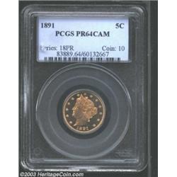 <TABLE cellSpacing=0 cellPadding=0 width="100%" bgColor=#000000 border=0><TBODY><TR><TD width="100%"><TABLE cellSpacing=1 cellPadding=3 width="100%" border=0><TBODY><TR><TD width="100%" bgColor=#79735c><FONT face=arial color=#ffffff size=3><B>Description</B> </FONT></TD></TR><TR><TD width="100%" bgColor=#ffffff><FONT face=arial size=2><B>1891 5C PR64 Cameo PCGS.</B></I> This is a gorgeously toned near-Gem, with deep amber-gold patina blanketing both sides. A few small contact marks reside on Liberty's cheek. Population: 8 in 64, 4 finer (8/03). </FONT></TD></TR></TBODY></TABLE></TD></TR></TBODY></TABLE><BR><A name=PricesRealized></A><TABLE cellSpacing=0 cellPadding=0 width="100%" bgColor=#000000 border=0><TBODY><TR><TD width="100%"><TABLE cellSpacing=1 cellPadding=3 width="100%" border=0><TBODY><TR><TD width="100%" bgColor=#79735c><A name=PR><FONT face=arial color=#ffffff size=3><B>Previous Prices from Heritage Auctions</B> </FONT></A></TD></TR><TR><TD bgColor=#f6f6ed><TABLE cellSpacing=0 cellPadding=0 width="100%" border=1><TBODY><TR><TD align=middle width="33%"><B>Date</B></TD><TD align=middle width="33%"><B>Service</B></TD><TD align=middle width="33%"><B>Price</B></TD></TR><TR bgColor=whitesmoke><TD width="33%"><B>01/11/2003</B></TD><TD width="33%">NGC</TD><TD width="33%">$373.75</TD></TR></TBODY></TABLE></TD></TR><TR><TD bgColor=#ffffff><FONT face=arial size=1 ?>PLEASE NOTE: All prices realized reflect the final hammer price PLUS the buyer's premium in auctions that charge a buyer's premium. Each item has a notation at the top of the listing indicating whether that lot included a buyer's premium. Example: A item that sells with a final hammer price of $100 and a 20% buyer's premium will display with a price realized of $120. All information listed is intended to be as accurate as possible, but errors are possible. Please use this guide carefully and inform us of any inaccuracies. </FONT></TD></TR></TBODY></TABLE></TD></TR></TBODY></TABLE><BR><TABLE cellSpacing=0 cellPadding=0 width="100%" bgColor=#000000 border=0><TBODY><TR><TD width="100%"><TABLE cellSpacing=1 cellPadding=3 width="100%" border=0><TBODY><TR><TD width="100%" bgColor=#79735c colSpan=6><FONT face=arial color=#ffffff size=3><B>Price Guide*</B> </FONT></TD></TR><TR bgColor=#f6f6ed><TD align=middle><B>Grade</B> </TD><TD align=middle><B>Coin World<BR>(Trends)</B> </TD><TD align=middle><B>Numismedia<BR>Retail</B> </TD><TD align=middle><B>Numismedia<BR>Wholesale</B> </TD><TD align=middle><B>Coin<BR>Universe</B> </TD><TD align=middle><B>Heritage<BR>Value Index</B> </TD></TR><TR bgColor=#ffffff><TD align=middle>63</TD><TD align=right>---</TD><TD align=right>---</TD><TD align=right>---</TD><TD align=right>---</TD><TD align=right>$130.50</TD></TR><TR style="FONT-WEIGHT: bold" bgColor=#cccfdd><TD align=middle>64</TD><TD align=right>---</TD><TD align=right>---</TD><TD align=right>---</TD><TD align=right>---</TD><TD align=right>$223.50</TD></TR><TR bgColor=#ffffff><TD align=middle>65</TD><TD align=right>---</TD><TD align=right>---</TD><TD align=right>---</TD><TD align=right>---</TD><TD align=right>$397.75</TD></TR><TR bgColor=#ffffff><TD colSpan=6><FONT size=1>*All information listed is intended to be as accurate as possible, but errors are possible. No item may be returned or refused based on this information which is provided as a service to our customers. You should contact each pricing source directly to determine the accuracy of this information. </FONT></TD></TR></TBODY></TABLE></TD></TR></TBODY></TABLE><BR><TABLE cellSpacing=0 cellPadding=0 width="100%" bgColor=#000000 border=0><TBODY><TR><TD width="100%"><TABLE cellSpacing=1 cellPadding=3 width="100%" border=0><TBODY><TR><TD width="100%" bgColor=#79735c><FONT face=arial color=#ffffff size=3><B>Population Guide</B> </FONT></TD></TR><TR bgColor=#ffffff><TD align=middle><!-- Begin Output of Population Grid--><TABLE cellSpacing=0 cellPadding=0 width="100%" border=0><TBODY><TR><TD vAlign=center><TABLE cellSpacing=0 width="100%" border=1 cellsadding="3"><TBODY><TR><TD vAlign=center><TABLE cellSpacing=0 cellPadding=3 width="100%" border=1><TBODY><TR><TD vAlign=center align=middle bgColor=#f0f1e8 colSpan=2 <CENTER><FONT face=Arial size=2><B>PCGS Pop </B></FONT><CENTER></CENTER></TD><TD vAlign=center align=middle bgColor=#f0f1e8 colSpan=2><CENTER><FONT face=Arial size=2><B>NGC Pop</B></CENTER></FONT></TD></TR><TR><TD vAlign=center><FONT face=Arial size=2>(64)</FONT> </TD><TD vAlign=center align=right><FONT face=Arial size=2>8</FONT> </TD><TD vAlign=center><FONT face=Arial size=2>(64)</FONT> </TD><TD vAlign=center align=right><FONT face=Arial size=2>7</FONT> </TD></TR><TR><TD vAlign=center><FONT face=Arial size=2>(>64)</FONT> </TD><TD vAlign=center align=right><FONT face=Arial size=2>4</FONT> </TD><TD vAlign=center><FONT face=Arial size=2>(>64)</FONT> </TD><TD vAlign=center align=right><FONT face=Arial size=2>28</FONT> </TD></TR></TBODY></TABLE></TD></TR></TBODY></TABLE></TD></TR></TBODY></TABLE><!-- End Output of Population Grid--> Important notice: Heritage usually auctions material at the rate of 200-250 lots per hour. On some occasions eBay Live bid software or the Internet may not be able to keep up with the pace of the auction. We recommend placing a realistic absentee bid now as insurance to avoid disappointment. Occasionally the auctioneer may eliminate or reject an eBay Live bid, and the auctioneer may also reopen a lot after the close of the eBay live bidding (usually because we missed an audience bid), and may reject your bid even if it shows you as the winning bidder. By bidding via eBay Live, you agree that Heritage may award the lot to another bidder at its sole discretion under the circumstances described above or any other reasonable circumstances. Also please note that all Heritage lots purchased through eBay Live carry a 20% Buyer's Premium. Please make sure you read the Terms and Conditions before you bid.</TD></TR></TBODY></TABLE></TD></TR></TBODY></TABLE>