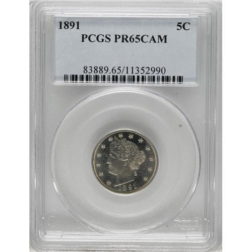 1891 5C PR65 Cameo PCGS. Glassy fields surround the cr