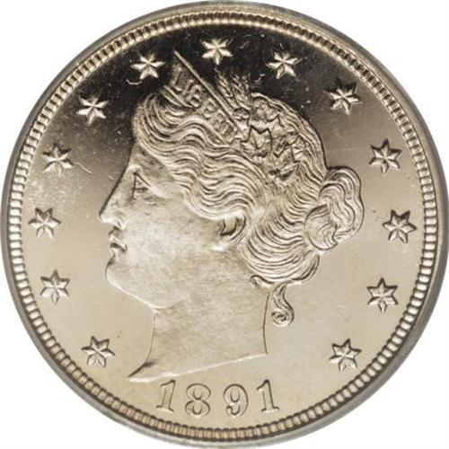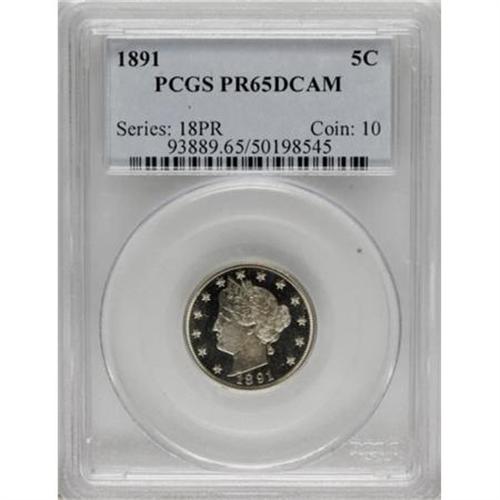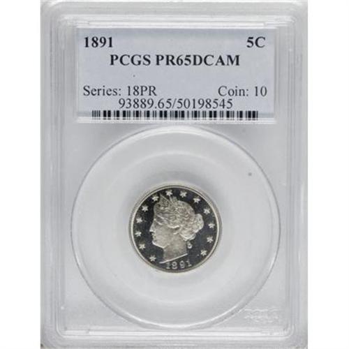 <B>1891 5C PR65 Deep Cameo PCGS.</B></I> The strong reflectivity of the fields heightens the contrast with the attractively frosted devices, contrast that is far stronger than on the usual Cameo example. Hints of incipient gold color are only visible under high magnification, and a powerful strike has imparted excellent definition to the design elements. This pretty Gem will stand out in almost any collection. Population: 2 in 65 Deep Cameo, 2 finer (6/07).<BR><BR><b>Shipping:</b> Coin/Currency (<a target="_blank" href="http://www.heritageauctions.com/common/shipping.php">view shipping information</a>)