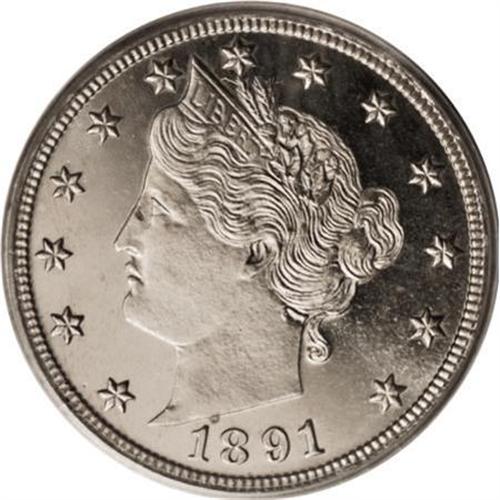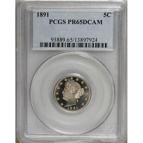 <B>1891 5C PR65 Deep Cameo PCGS.</B></I> This razor-sharp Gem exhibits ice-white motifs, and the fields are deeply mirrored. Close to brilliant, although glimpses of sky-blue visit the reverse periphery. Most proof 1891 nickels have minimal contrast, and likely only the initial pieces struck from fresh dies are true cameos. Population: 3 in 65 Deep Cameo, 2 finer (7/07).<BR><BR><b>Shipping:</b> Coins & Currency (<a target="_blank" href="http://www.heritageauctions.com/common/shipping.php">view shipping information</a>)