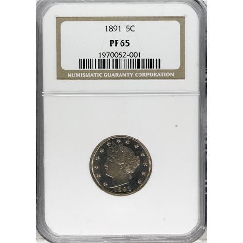 <B>1891 5C PR65 NGC.</B></I> This is a sharply detailed proof with excellent contrast between the fields and devices, although not sufficient to garner a Cameo designation from NGC. The surfaces are fully brilliant beneath light gold toning.<BR><BR><b>Shipping:</b> Coins & Currency (<a target="_blank" href="http://www.heritageauctions.com/common/shipping.php">view shipping information</a>)