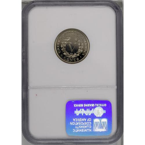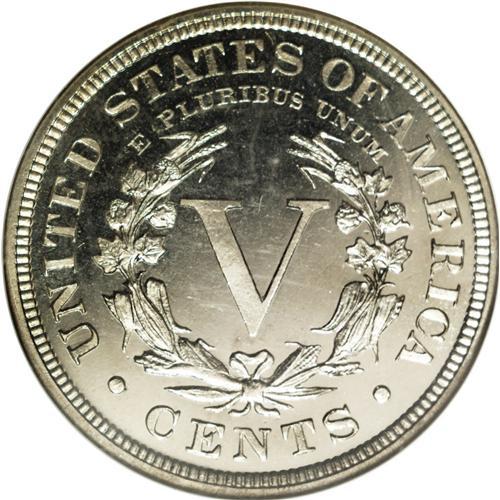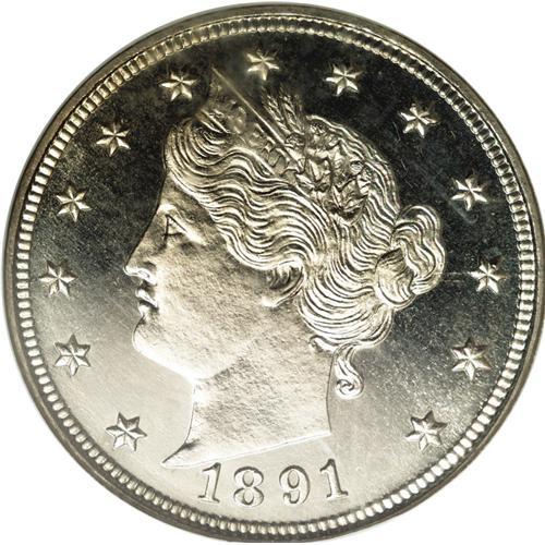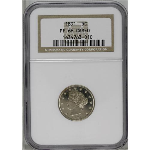 <B>1891<5C> PR66 Cameo NGC.</B></I> Due to the nature of the material, coins of the nickel composition are not often encountered with cameo contrast. This example has just enough contrast on each side to warrant the Cameo designation. The surfaces are enhanced by pale champagne toning, with lightly frosted devices and deeply mirrored fields.