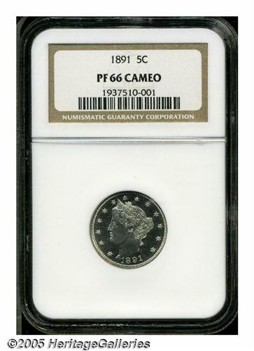 <B>1891<5C> PR66 Cameo NGC.</B></I> This brilliant premium Gem has a full strike on the left ear of corn and on Liberty's hair, and only the two uppermost stars are not completely brought up by the dies. Good white on black contrast confirms the Cameo designation. Population: 17 in 66 Cameo, 2 finer (5/05).