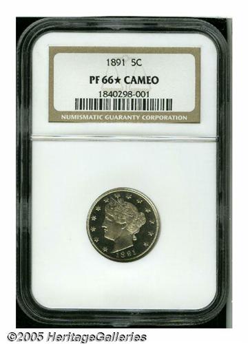 <B>1891<5C> PR66 <S Cameo NGC.</B></I> Softly struck on the obverse stars, and on the reverse left ear of corn, with richly frosted devices, deeply reflective fields, a small lintmark (as struck) in the reverse field just left of the Roman numeral V, and a small planchet void (as made) in the upper reverse field area below IB. A well preserved, highly attractive premium Gem.