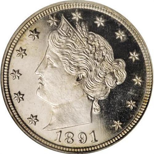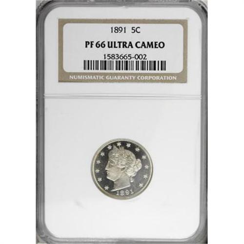 <B>1891 5C PR66 Ultra Cameo NGC.</B></I> Whispers of gold patina visit the peripheries of this still largely untoned Liberty nickel proof, with immense contrast between the frosty devices and glassy fields. The sharp strike further complements the attractive package. This issue is seldom seen with such deep cameo contrast, and this piece is tied with one other at NGC and exceeded only by a single PR67 Ultra Cameo (12/07).<BR><BR><b>Shipping:</b> Coins & Currency (<a target="_blank" href="http://www.heritageauctions.com/common/shipping.php">view shipping information</a>)