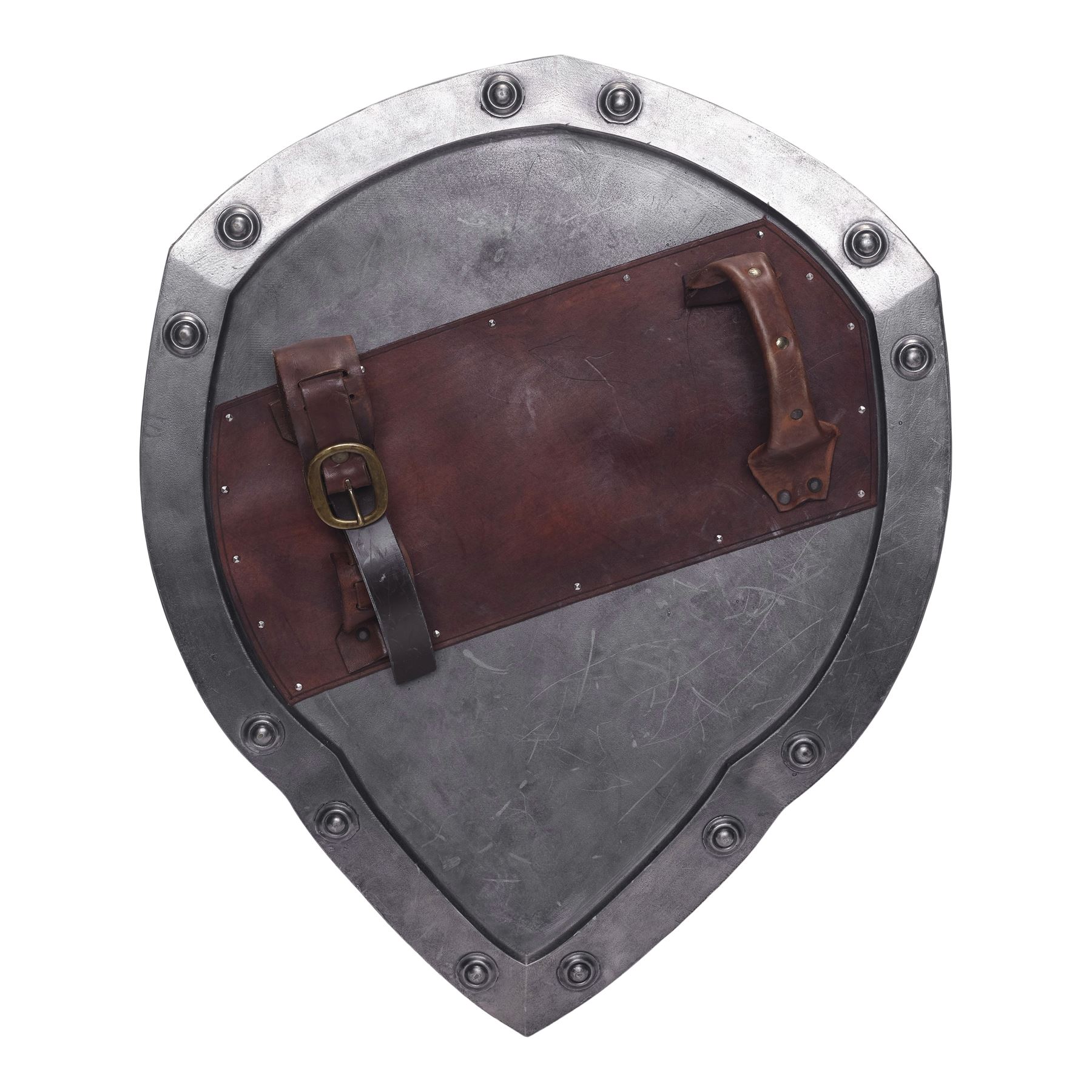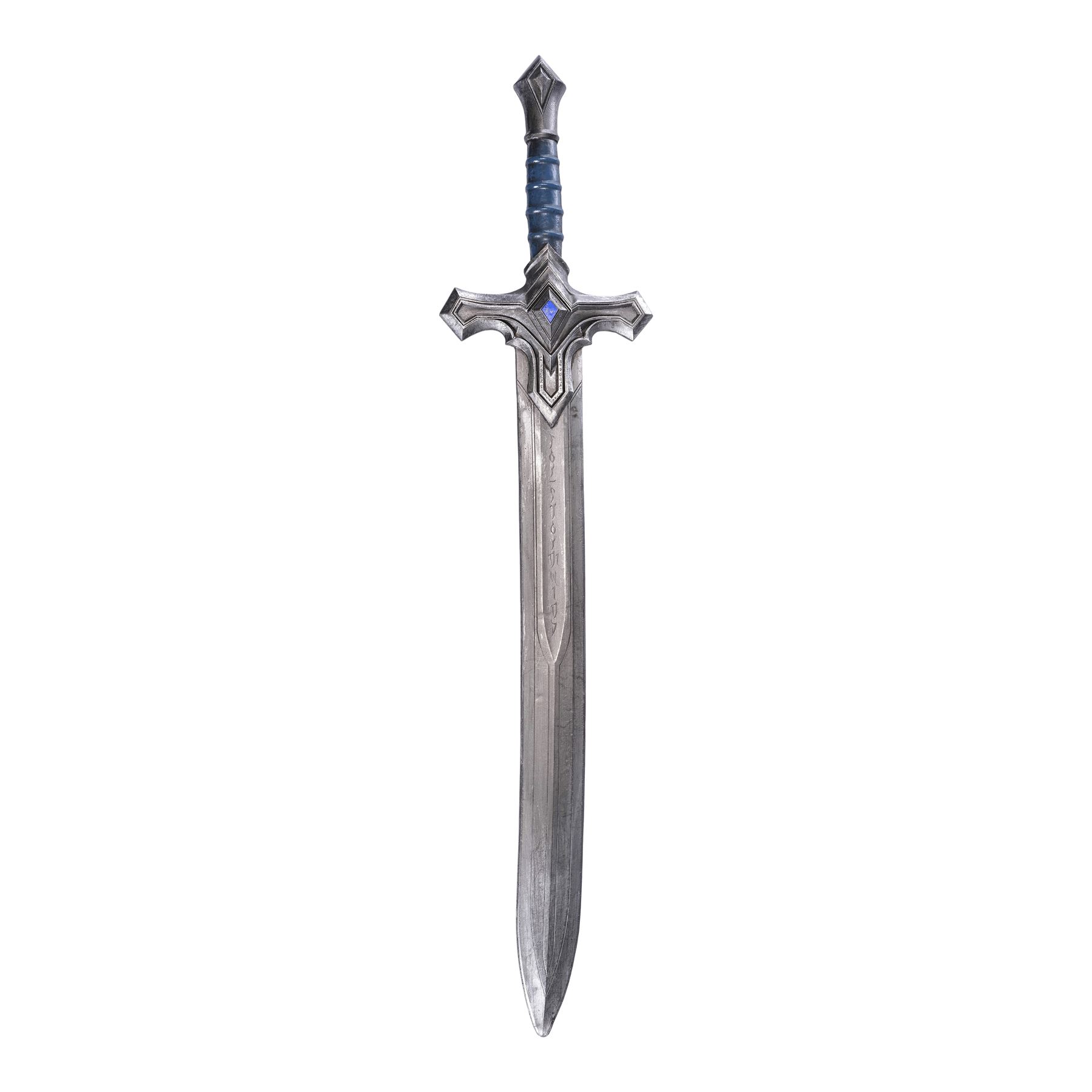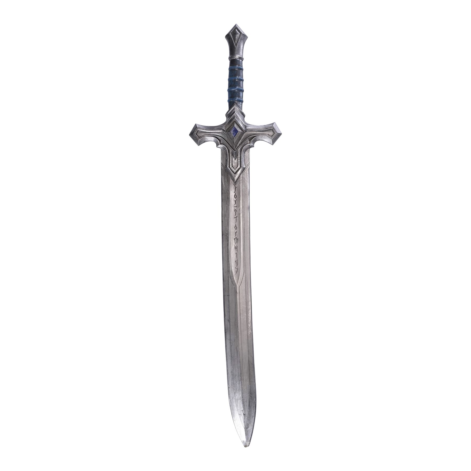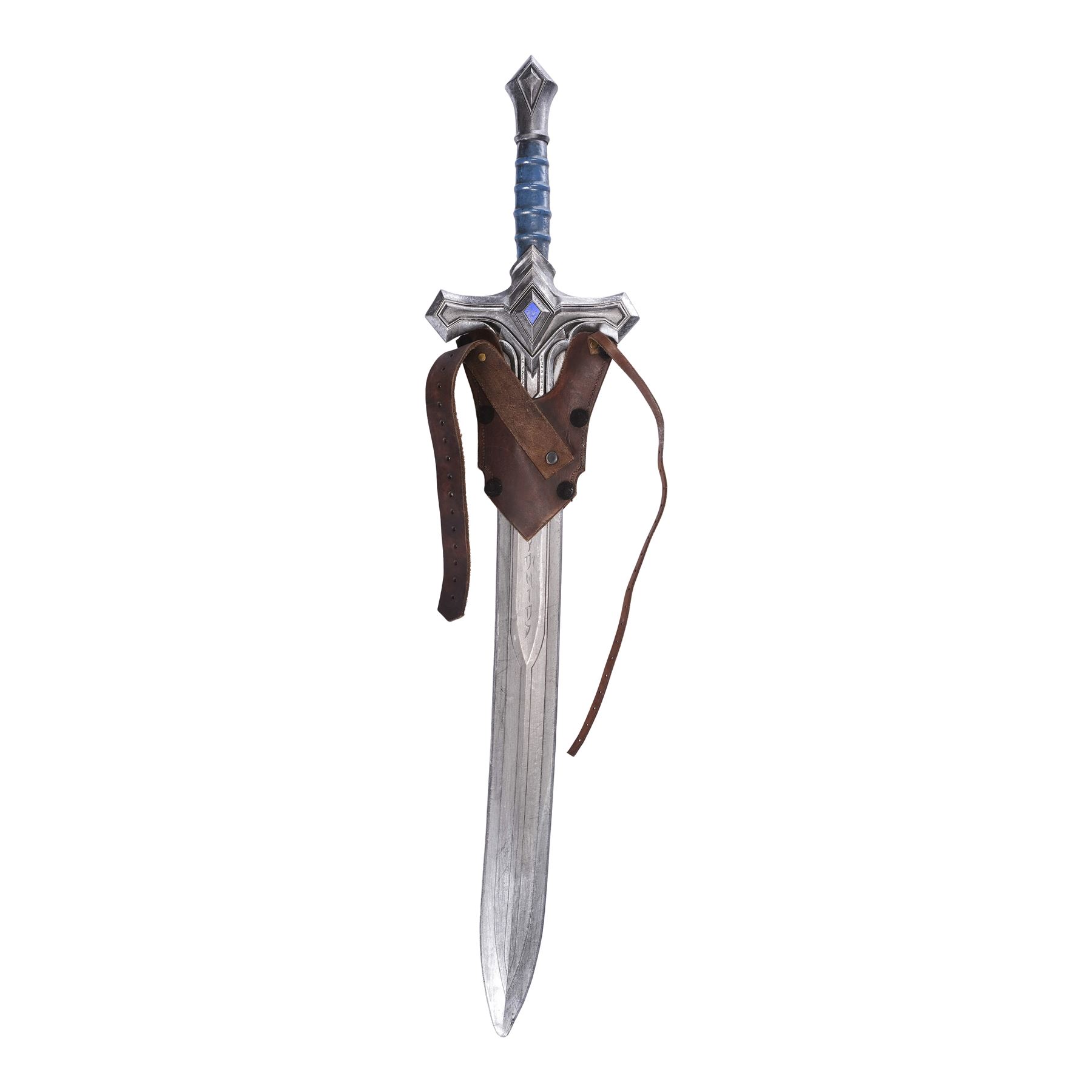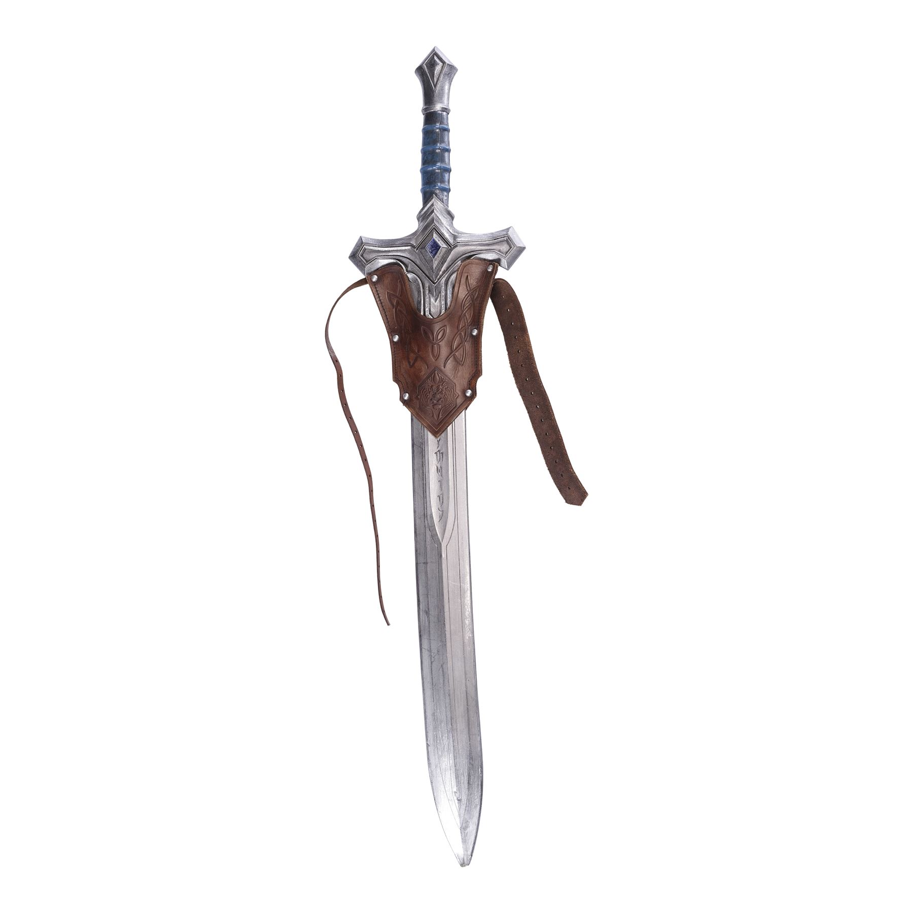 This lot consists of a urethane shield painted silver and blue, engraved with a Stormwind lion emblem on front, and affixed with leather arm straps on the reverse; a matching sword engraved with runes and inset with two blue faux gemstones; and a brown leather scabbard engraved with the Stormwind lion. Each was created by WETA Workshop and distressed by production to appear battle-used. The sword's tip has broken off, and the leather exhibits cracking from age. Dimensions: (largest) 43" x 23" x 7" (109.25 cm x 58.5 cm x 17.75 cm)
