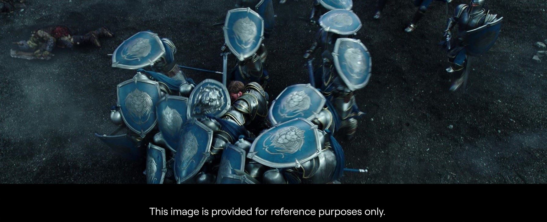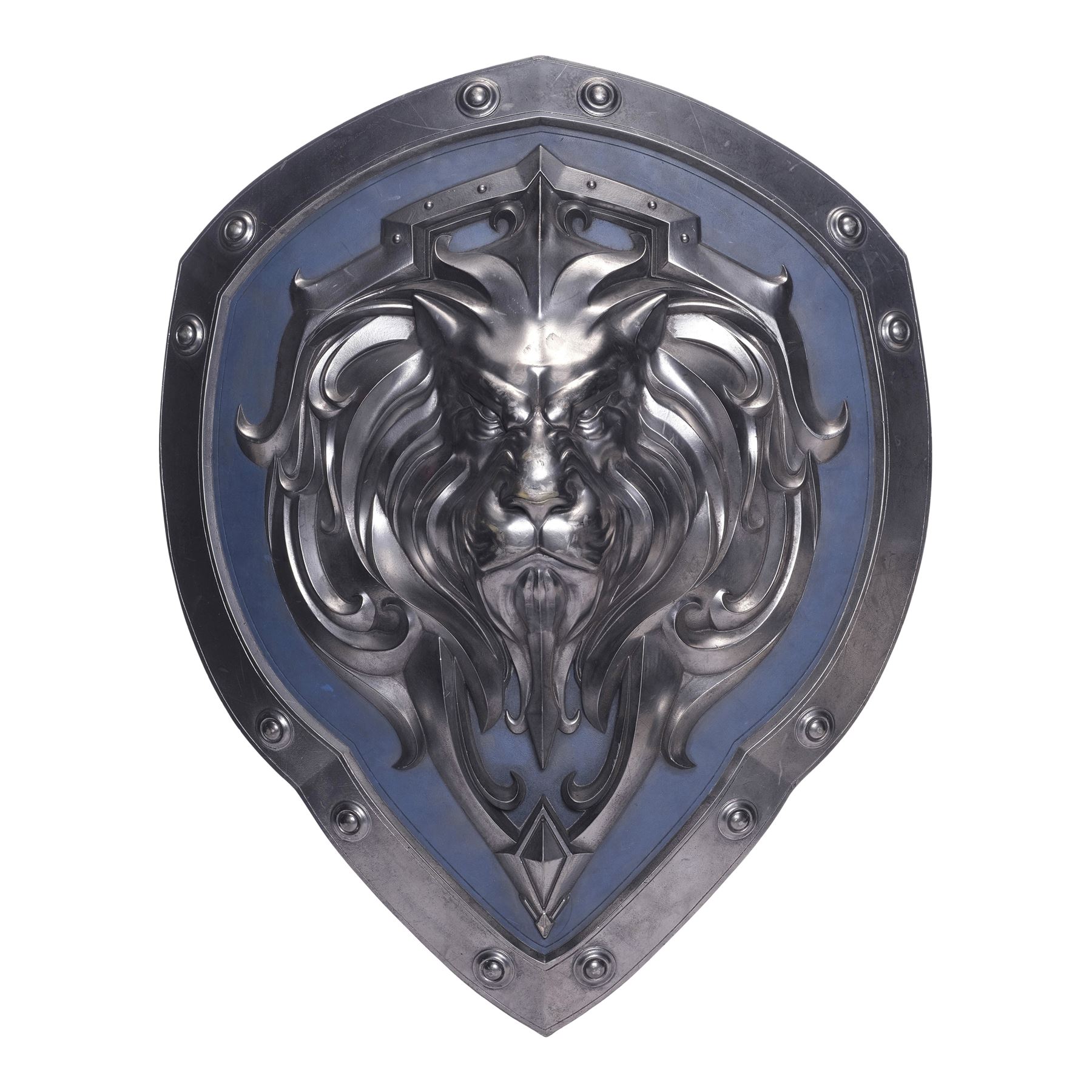 WARCRAFT (2016) - Alliance Knight's Shield with Foot Soldier Sword and Scabbard - An Alliance knight's shield with a foot soldier sword and scabbard from Legendary Pictures' Warcraft. King Llane's (Dominic Cooper) honorable knights fought alongside soldiers of the Alliance to protect Stormwind from the Orc Horde.