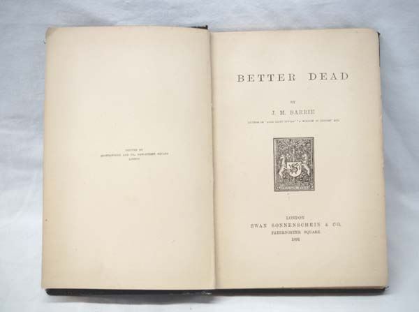1891 Better Dead by J.M. Barrie Hardback Book, Swan Sonnenschein & Co, 1891. First Edition, was Originally published in 1888 in soft cover pictoral wraps, this is the first edition in hardback form. It was the author's first book. Wear to the coarse cloth binding. 1st page inside cover is loose. Color chromolithograph frontispiece. 145pgs.