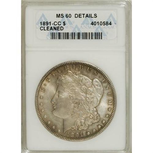 <B>1891-CC $1 --Cleaned--ANACS. MS60 Details.</B></I> NGC Census: (85/4811). PCGS Population (313/9602). Mintage: 1,618,000. Numismedia Wsl. Price for NGC/PCGS coin in MS60: $271. (#7206)<BR><BR><B>Coin Engraver:</B> George T. Morgan<BR><BR><b>Shipping:</b> Coins & Currency (<a target="_blank" href="http://www.heritageauctions.com/common/shipping.php">view shipping information</a>)