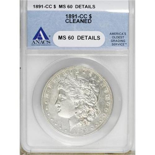 <B>1891-CC $1 --Cleaned--ANACS. MS60 Details.</B></I> NGC Census: (85/4920). PCGS Population (313/9673). Mintage: 1,618,000. Numismedia Wsl. Price for NGC/PCGS coin in MS60: $271. (#7206)<BR><BR><B>Coin Engraver:</B> George T. Morgan<BR><BR><b>Shipping:</b> Coins & Currency (<a target="_blank" href="http://www.heritageauctions.com/common/shipping.php">view shipping information</a>)