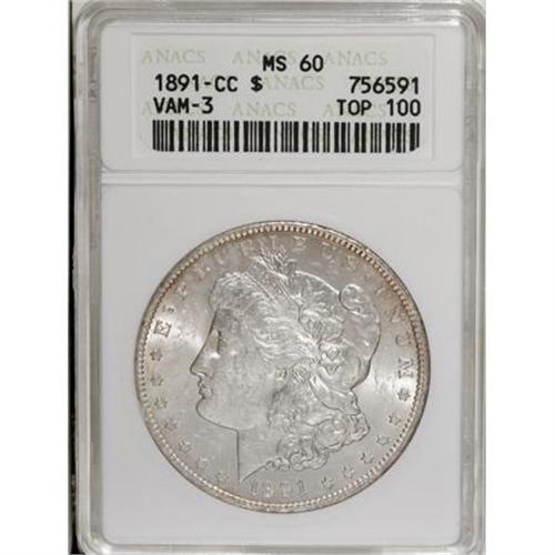 <B>1891-CC $1 MS60 ANACS.</B></I> Vam-3 Top 100. NGC Census: (86/5015). PCGS Population (313/9754). Mintage: 1,618,000. Numismedia Wsl. Price for NGC/PCGS coin in MS60: $271. (#7206)<BR><BR><B>Coin Engraver:</B> George T. Morgan<BR><BR><b>Shipping:</b> Coins & Currency (<a target="_blank" href="http://www.heritageauctions.com/common/shipping.php">view shipping information</a>)