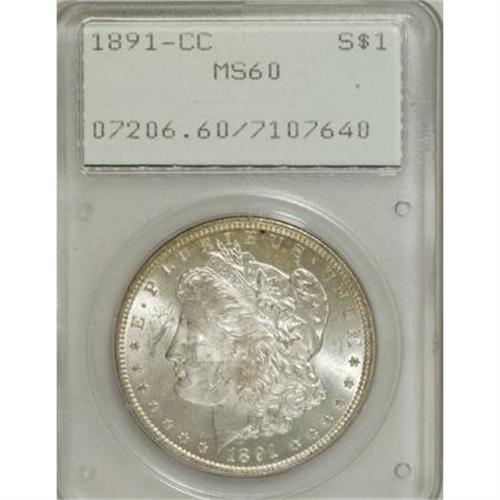<B>1891-CC $1 MS60 PCGS.</B></I> PCGS Population (312/9490). NGC Census: (85/4752). Mintage: 1,618,000. Numismedia Wsl. Price for NGC/PCGS coin in MS60: $271. (#7206)<BR><BR><B>Coin Engraver:</B> George T. Morgan<BR><BR><b>Shipping:</b> Coins & Currency (<a target="_blank" href="http://www.heritageauctions.com/common/shipping.php">view shipping information</a>)