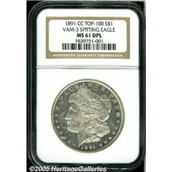 <B>1891-CC<img border='0' src='http://www.heritagecoins.com/images/star.gif' width=10 height=10>$1 MS61 Deep Mirror Prooflike NGC.</B></I> VAM-3. A Top 100 Variety. Although the "Spitting Eagle" is among the more available VAMs within the Top 100 ranking, DMPLs are scarce. This suitably struck and flashy piece is brilliant aside from a few toning flecks in Liberty's hair. A reeding mark on the neck and a few other blemishes confirm the grade.