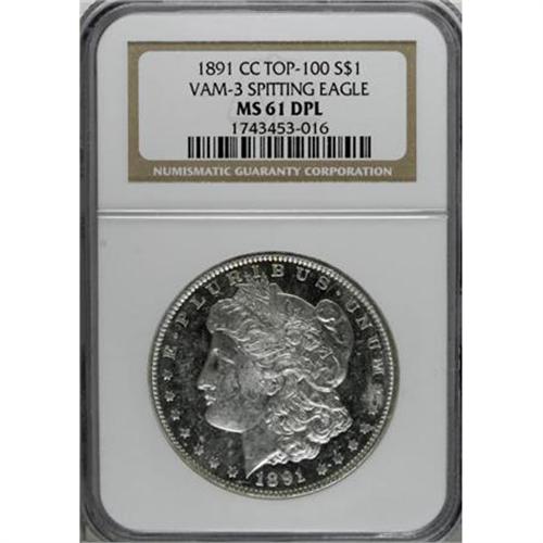 <B>1891-CC $1 MS61 Deep Mirror Prooflike NGC.</B></I> VAM-3. A Top 100 Variety. A boldly impressed, deeply reflective example of this ever-popular Carson City VAM. Scattered haze graces the surfaces. While the obverse shows a number of grade-defining abrasions, the reverse is comparatively clean.<BR><BR><b>Shipping:</b> Coins & Currency (<a target="_blank" href="http://www.heritageauctions.com/common/shipping.php">view shipping information</a>)