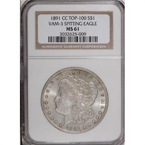 <B>1891-CC $1 Spitting Eagle MS61 NGC.</B></I> Vam-3 Top-100. NGC Census: (436/4579). PCGS Population (781/8973). Mintage: 1,618,000. Numismedia Wsl. Price for NGC/PCGS coin in MS61: $320. (#7206)<BR><BR><B>Coin Engraver:</B> George T. Morgan<BR><BR><b>Shipping:</b> Coins & Currency (<a target="_blank" href="http://www.heritageauctions.com/common/shipping.php">view shipping information</a>)