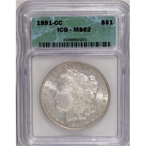 <B>1891-CC $1 MS62 ICG.</B></I> NGC Census: (1254/3337). PCGS Population (2127/6891). Mintage: 1,618,000. Numismedia Wsl. Price for NGC/PCGS coin in MS62: $420. (#7206)<BR><BR><B>Coin Engraver:</B> George T. Morgan<BR><BR><b>Shipping:</b> Coins & Currency (<a target="_blank" href="http://www.heritageauctions.com/common/shipping.php">view shipping information</a>)