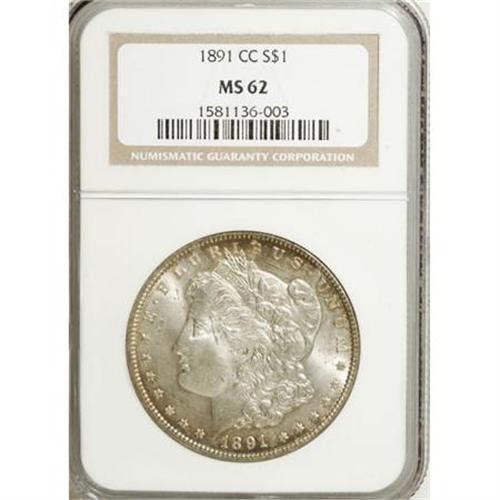 <B>1891-CC $1 MS62 NGC.</B></I> NGC Census: (1170/3232). PCGS Population (2111/6713). Mintage: 1,618,000. Numismedia Wsl. Price for NGC/PCGS coin in MS62: $383. (#7206)<BR><BR><B>Coin Engraver:</B> George T. Morgan<BR><BR><b>Shipping:</b> Coins & Currency (<a target="_blank" href="http://www.heritageauctions.com/common/shipping.php">view shipping information</a>)