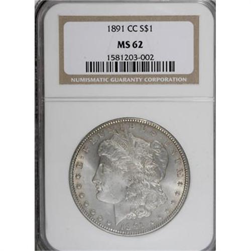 <B>1891-CC $1 MS62 NGC.</B></I> NGC Census: (1197/3282). PCGS Population (2116/6770). Mintage: 1,618,000. Numismedia Wsl. Price for NGC/PCGS coin in MS62: $383. (#7206)<BR><BR><B>Coin Engraver:</B> George T. Morgan<BR><BR><b>Shipping:</b> Coins & Currency (<a target="_blank" href="http://www.heritageauctions.com/common/shipping.php">view shipping information</a>)