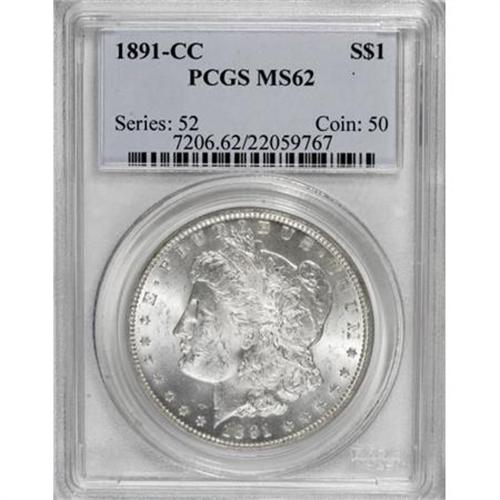 <B>1891-CC $1 MS62 PCGS.</B></I> PCGS Population (2107/6658). NGC Census: (1170/3232). Mintage: 1,618,000. Numismedia Wsl. Price for NGC/PCGS coin in MS62: $383. (#7206)<BR><BR><B>Coin Engraver:</B> George T. Morgan<BR><BR><b>Shipping:</b> Coins & Currency (<a target="_blank" href="http://www.heritageauctions.com/common/shipping.php">view shipping information</a>)