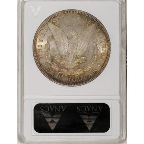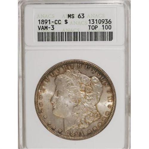 <B>1891-CC $1 MS63 ANACS.</B></I> VAM-3. A Top 100 Variety. Splashes of orange-red and sea-green embrace the borders of this lustrous and original Select Carson City dollar. The strike is good, and marks are limited to minor ticks on the face.<BR><BR><B>Coin Engraver:</B> George T. Morgan<BR><BR><b>Shipping:</b> Coins & Currency (<a target="_blank" href="http://www.heritageauctions.com/common/shipping.php">view shipping information</a>)