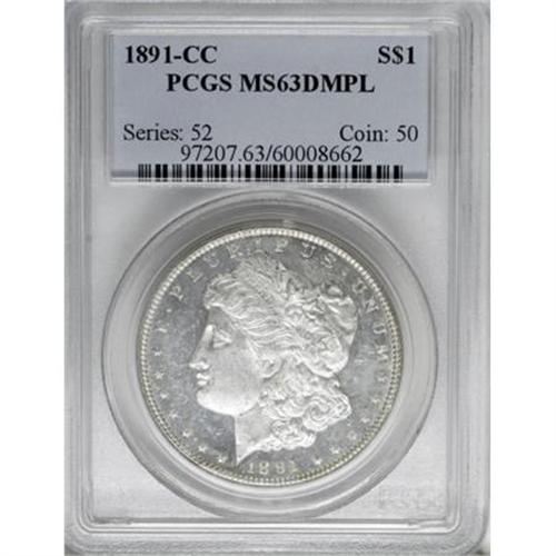 <B>1891-CC $1 MS63 Deep Mirror Prooflike PCGS.</B></I> The delicately frosted, boldly struck devices offer mild contrast with the flashy and intensely reflective fields. Subtle haze drapes the surfaces, while the eagle shows distinct orange toning on its breast and tailfeathers. Light, scattered abrasions account for the grade.<BR><BR><b>Shipping:</b> Coins & Currency (<a target="_blank" href="http://www.heritageauctions.com/common/shipping.php">view shipping information</a>)