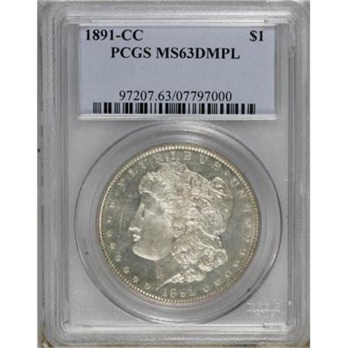 <B>1891-CC $1 MS63 Deep Mirror Prooflike PCGS.</B></I> Select and highly appealing. The strike may be typical, but this coin's deep reflectivity and significant contrast are not. Hazy champagne patina covers each side, and a dark spot appears on the left branch of the wreath. The scattered abrasions on each side, made more obvious by the mirrored fields, account for the grade.<BR><BR><b>Shipping:</b> Coins & Currency (<a target="_blank" href="http://www.heritageauctions.com/common/shipping.php">view shipping information</a>)